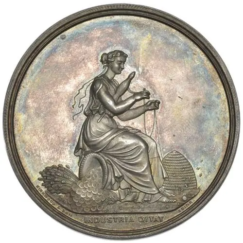 | Obverse description | Industria seated spinning, hive, sheaf and cornucopia of coins beside her |