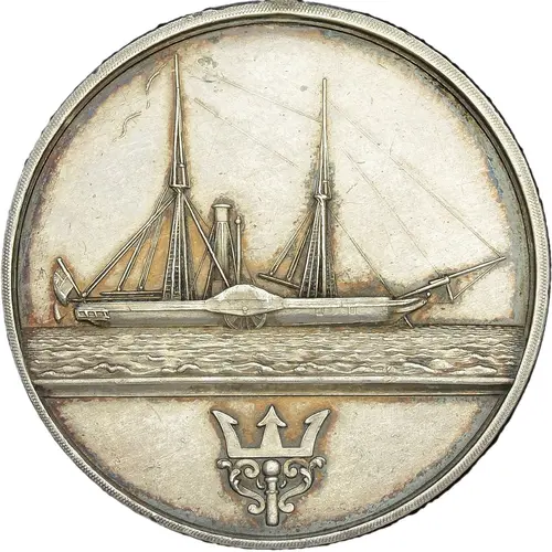 | Aversbeschreibung | Starboard broadside view of two-masted paddle steamer, ornamented trident head below |