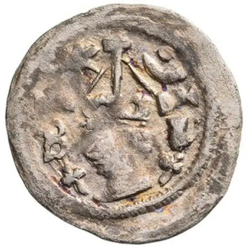 Crowned head facing left, above star and crescent with a dot, mintmark at sides |