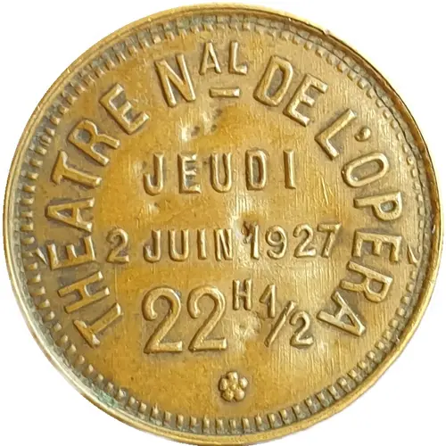 | Obverse lettering | THEATRE Nal DE L`OPERA JEUDI 2 JUIN 1927 22H 1/2 |
