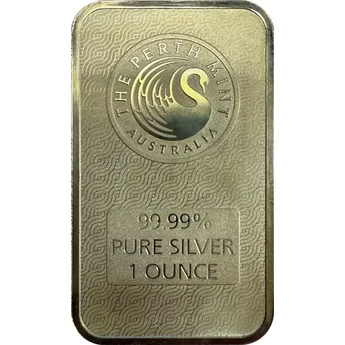 | Description de l’avers | The bullion bar has a wavy base pattern running diagonally ascending from the left to the right. On the upper half of the bar, there is a circle with a double edge with the Perth Mint logo (Swan) in the middle and the mint`s name and the country around it. The lover half contains the fineness and the weight in ounces in a rectangle. |