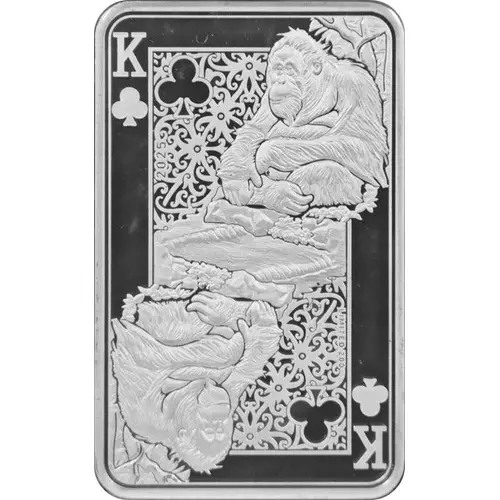 | Obverse description | The front of this silver bar features an intricate King of Clubs playing card design. It highlights an engraving of an orangutan, seated in a natural setting with rocks and foliage, adding a wildlife touch to the card's theme. The "K" for King and the Clubs symbol are integrated into the artwork, along with the year "2025" engraved at the top. At the bottom, it is marked with "LIMITED 200," indicating that this is a limited edition release with only 200 pieces available, enhancing its exclusivity. |