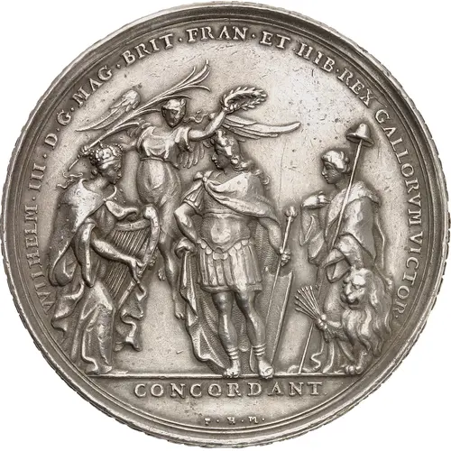 WILHELM.III.D.G.MAG.BRIT.FRAN.ET.GIB.REX GALLORVM VICTOR. CONCORDANT. F. H. M. |
