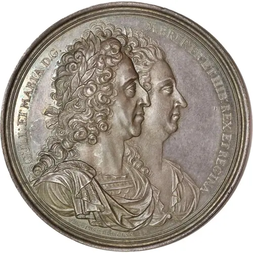 توضیحات روی مدال Busts conjoined, right, of William III and Mary II, both laureate. He, hair rather long, wears scale armour and embroidered mantle: she is draped, with brooch in front.
