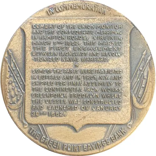 | Obverse lettering | IN COMMEMORATION COMBAT OF THE UNION MONITOR AND THE CONFEDERATE MERRIMAC IN HAMPTON ROADS, VIRGINIA, MARCH 9TH 1862. THIS MARKED THE FIRST ENGAGEMENT BETWEEN IRONCLADS AND REVOLU- -TIONIZED NAVAL WARFARE. ★ SOME OF THE PARTS WERE FABRICATED IN BUFFALO AND IN TROY, N.Y. AND SHIPPED FOR FINAL ASSEMBLY TO THE CONTINENTAL IRON WORKS, GREENPOINT, BROOKLYN WHERE THE VESSEL WAS CONSTRUCTED AND LAUNCHED ON JANUARY 30TH 1862. THE GREEN POINT SAVINGS BANK |