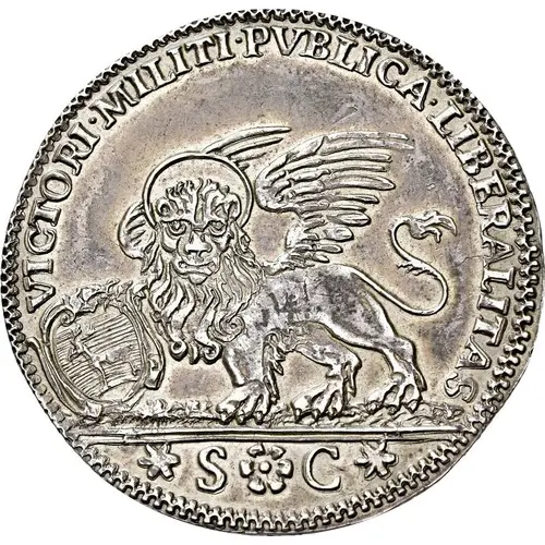 | Obverse description | Nimbate Lion of Saint Mark turned left, holding the arms with the Civran family arms. |