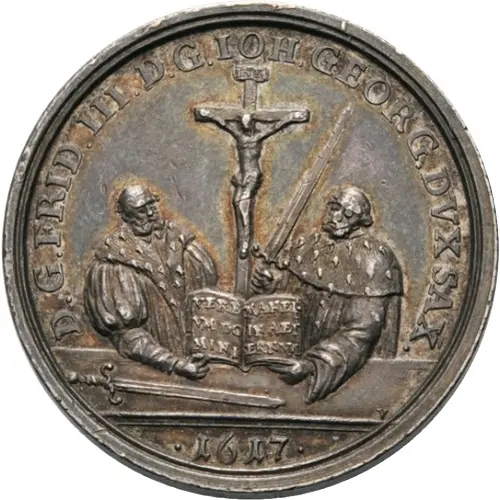Friedrich der Weise and Johann Georg with sword standing behind a table and holding a book, between them a cross with Jesus Christ. |