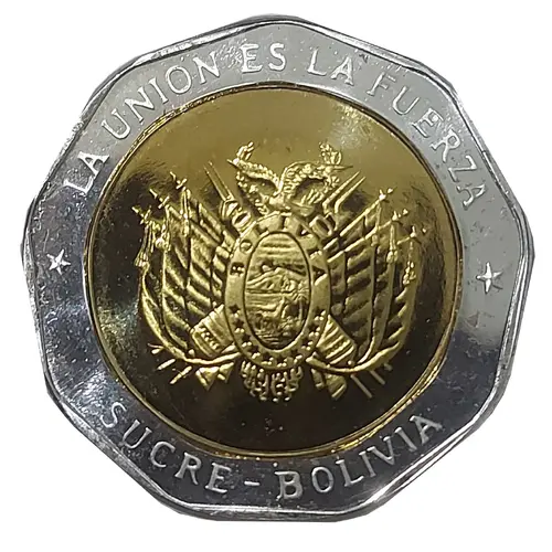 | Aversbeschreibung | Bolivian coat of arms, motto on top, location and country name on bottom. |