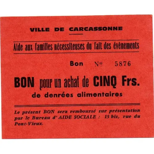 Obverse lettering Ville de Carcassonne Aide aux familles nécessiteuses du fait des évènements Bon pour un achat de CINQ Frs. de denrées alimentaires Le présent bon sera remboursé sur présentation par le Bureau d`AIDE SOCIALE : 15 bis, rue du Pont-Vieux