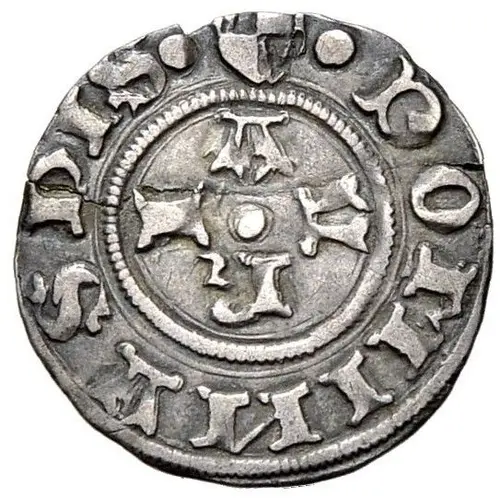 裏面の説明 Large gothic A with four pellets around, inside reeded inner circle. Pair of deer antlers at top.