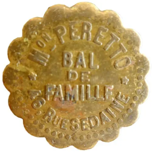 | Obverse lettering | Mon PERETTO BAL DE FAMILLE 46, RUE SEDAINE PARIS |