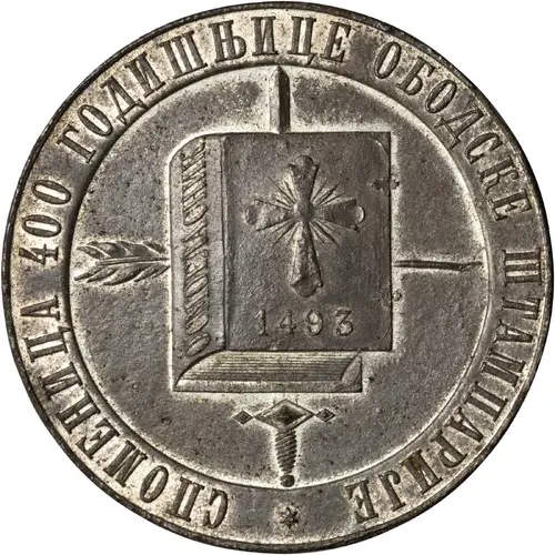 | Chữ khắc mặt trước | CПOMEHИЦA 400 ГOДИШЊИЦE OБOДCKE ШTAMПAPИJE OCMOГЛACHИK 1493 |