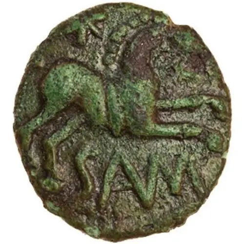 Historical Context: This Bronze 1/2 Unit, the "Sam Sam" type (ABC#381), was issued by the Cantii tribe in southeastern Celtic Britain, 1-10 AD. This era, preceding full Roman invasion, reflects evolving tribal economies and continental interaction. The Cantii, in modern Kent, maintained a distinct identity, though influenced by powerful neighbors. Issuance of small denomination bronze like this "1/2 Unit" signifies a developed local economy requiring fractional currency, complementing larger gold/silver issues and indicating societal sophistication.