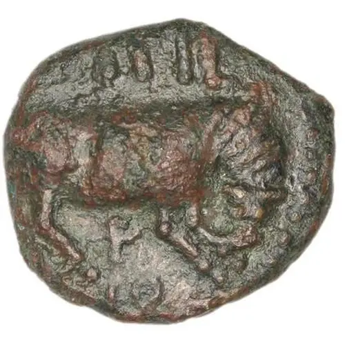 | Descripción del anverso | Butting bull right. Inscription above and below. Pellet border. |