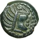 | Descrição do anverso | Stylized head right, with triangular eye and parallel locks of hair; beaded circle around. |