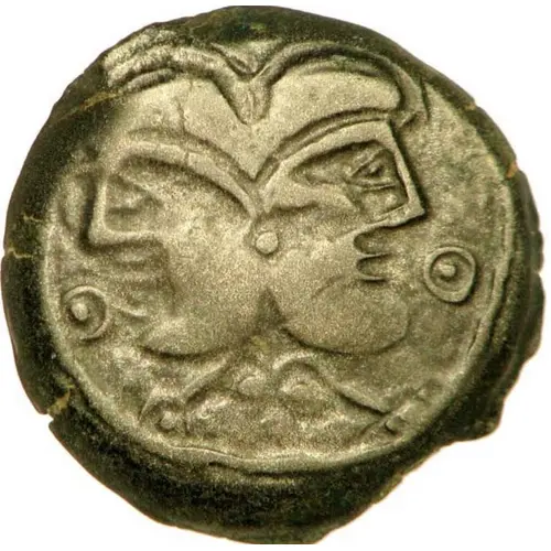 | Beschrijving voorzijde | Bearded and helmeted janiform head, two S below and rings in front of the mouth, listel. |