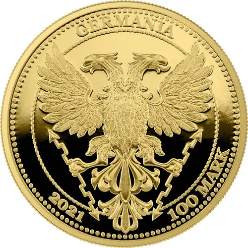 Script: Latin Lettering: GERMANIA 2021 100 MARK Reverse Chestnut leaf. Below chestnut. To the left, inscription. Script: Latin Lettering: •CHESTNUT LEAF• •1 oz 999.9 FINE GOLD• Edge Reeded Mint Germania Mint, Jelenia Góra, Poland (2018-date) |
