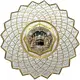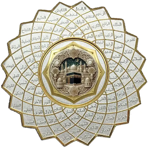 The front side of this 5 oz silver piece showcases an exquisite geometric composition featuring the 99 Names of Allah, meticulously engraved in radiating segments with alternating silver and gold accents. At the center lies a detachable 1 oz medallion, crafted in multi-layer high relief, depicting the Masjid al-Haram with the Kaaba beneath a star-lit sky. Surrounding it, the 4 oz outer ring is finished with a beautifully crafted scalloped edge, adding a distinctive architectural elegance to the overall design. |