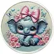 This silver medallion features a sweet baby elephant with sparkling blue skin tones, adorned with a bright pink bow and surrounded by blooming flowers. Glitter accents enhance the pastel palette, giving the piece a soft and magical feel. |