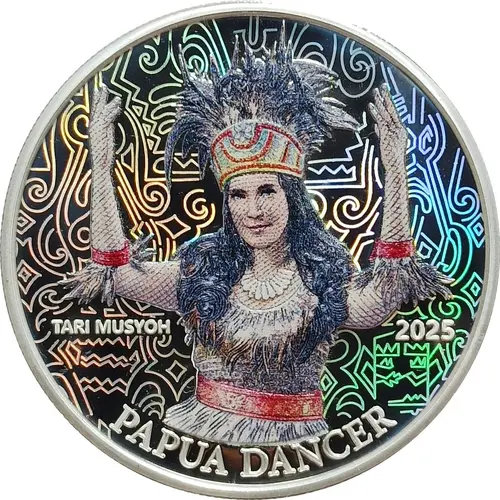 | Obverse description | A Papua dancer performing the sacred Tari Musyoh, enhanced with holographic patterns that reflect the spiritual energy of the ritual. The design celebrates Papua’s rich cultural heritage and ancestral traditions. |