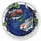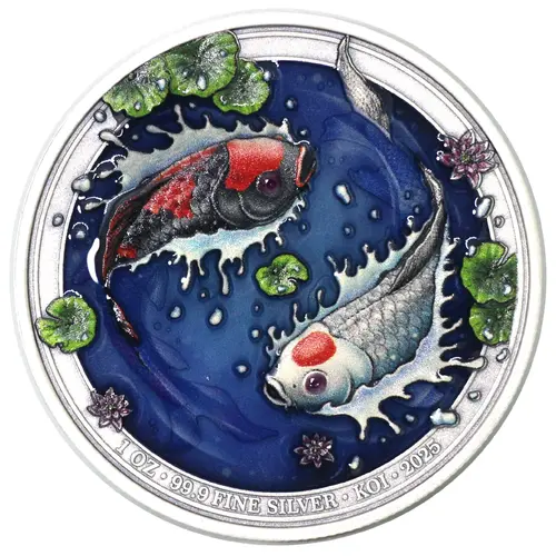 Official design titled “Yin-Yang Koi”, depicting two koi fish swimming in harmony, representing balance, perseverance, and good fortune. The koi are beautifully enameled in vivid red, black, and white tones, surrounded by splashing blue water, lotus flowers, and green lily pads. Each koi is adorned with a raised eye made of gem-like material, adding a striking three-dimensional effect. Along the rim is the inscription “1 OZ · 99.9 FINE SILVER · KOI · 2025”, denoting the weight, purity, and release year of the coin. |