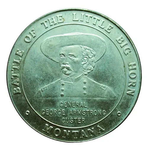 Image and title of General George Armstrong Custer, Addition letter around perimeter of face of token |