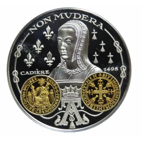 | Obverse description | Reproduction of Anne de Bretagne`s 1498 gold-plated cadiere on a silver coin. |