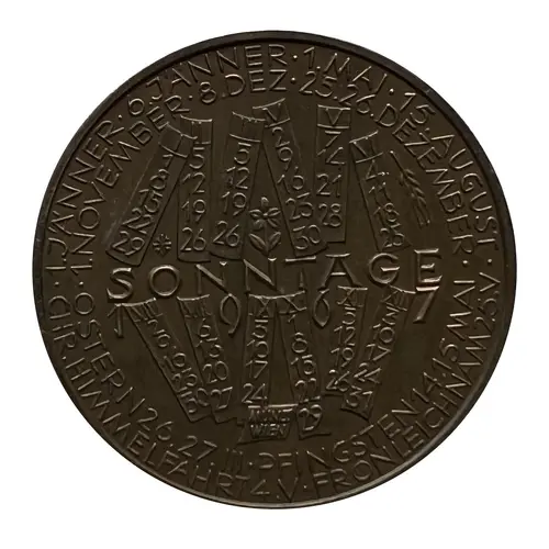 | Obverse lettering | 1. JÄNNER 6. JÄNNER 1. MAI 15. AUGUST 1. NOVEMBER 8. DEZ 25.26. DEZEMBER SONNTAGE OSTERN 26.27.III PFINGSTEN 14.15 MAI CHR. HIMMELFAHRT 4.V. FRONLEICHNAM 25.V |