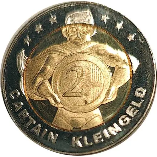 Obverse description Features “Captain Kleingeld”, a cartoon-style figure holding a large 2 Euro coin, surrounded by stars. The playful design emphasizes small change (“Kleingeld”) and collecting, giving the token a light-hearted, promotional character. The name CAPTAIN KLEINGELD appears along the lower edge.