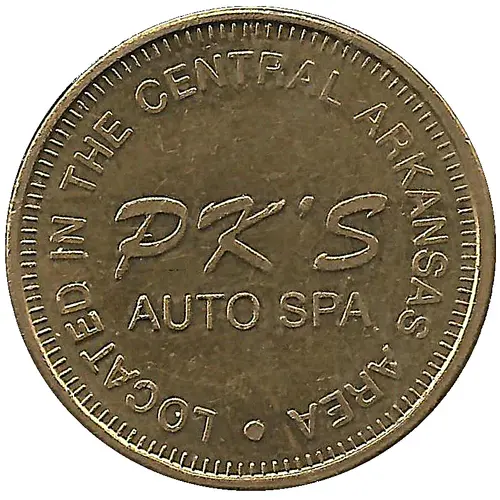 | Obverse description | Hash Mark around Token. Located in the Central Arkansaw Area around coin with raised dot at bottom. PK`S Auto Spa in center. |