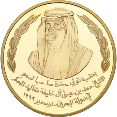 بمناسبة تولي حضرة صاحب السمو الشيخ حمد بن عيسى آل خليفة مقاليد الحكمـ في دولة البحرين - ديسمبر ١٩٩٩ (Translation: For the occasion of His Highness Sheikh Hamad Bin Isa Al Khalifa accession to the throne as Emir of the State of Bahrain - December 1999) |