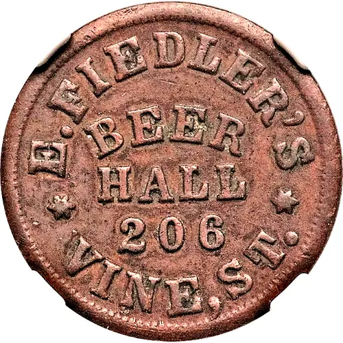 | Obverse lettering | E.FIEDLER`S BEER HALL 206 VINE,ST. |