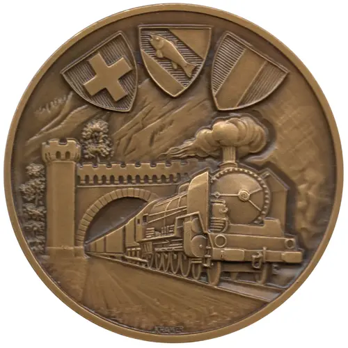 | Obverse description | Steam train emerging from a tunnel. Above, the coats of arms of Switzerland (left), Vallorbe (centre) and France (right). |