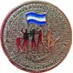 Honduran flag on top of a group of six citizens celebrating with raised arms. Below the designer`s initials. Everything surrounded by legends separated by stars. |