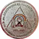 Pyramid coat of arms with legend around separated with stars. Inside the pyramid a volcano behind it are a sun and a rainbow. |
