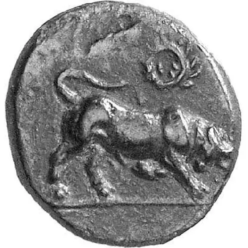 | Opis awersu | Bull butting right; above, wreath; groundline. |