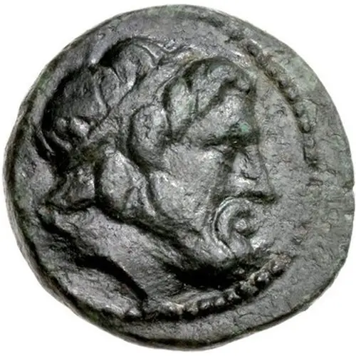 Ön yüz açıklaması Diademed and bearded head of Zeus right, border of dots.