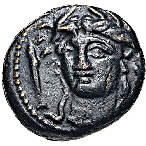 | Ön yüz açıklaması | Head of the water nymph Hypereia facing slightly left, wearing a wreath of reeds. To the left, a fish swimming upward. |