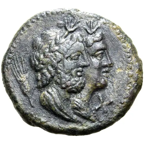 | Obverse description | Judgate busts of god Serapis and goddess Isis facing right. Serapis wearing laurel wreath and Atef crown (Egyptian white feather crown). Isis wearing headdress. Wheat ear in left field. |
