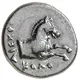 | Reverse description | Forepart of horse right; magistrate name to left. |