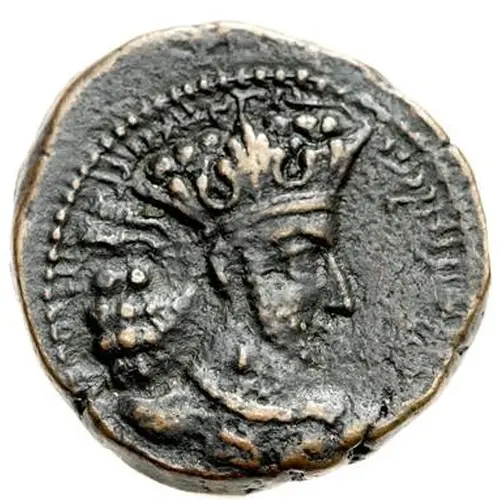 | 表面の説明 | Bust of king to right; crown of 3 pinnacles shaped like palmattes, surmounted by large pearls; diadem with fillet below, bushy hair, point of beard drawn through ring; ear-ring, necklace of pearls, bust cut in form of four lobes. Indistinct sign in field in front of face. |