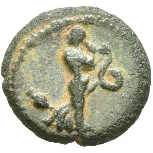 | Description de l’avers | Nymph holding upright snake, oenochoe in left field. |