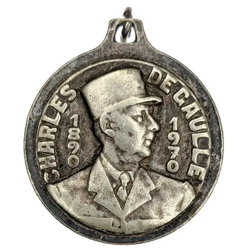 正面描述 Right-turned bust of General Charles de Gaulle. Dates vertically on either side, with the legend around it.