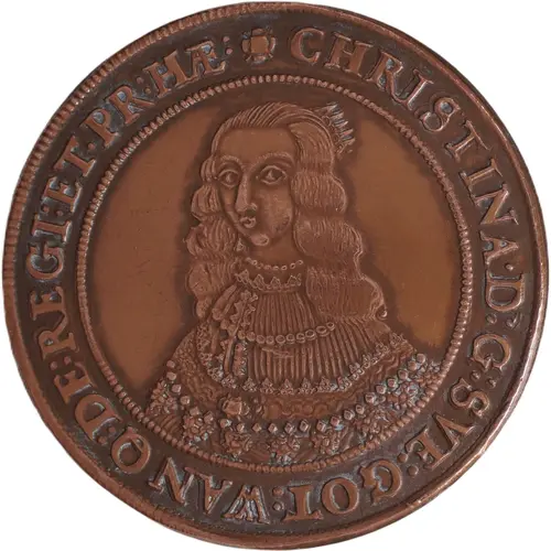Dressed bust of Christina of Sweden, slightly to the left, surrounded by a border of pearls. |