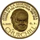 Winston Churchill facing right, text in Spanish and English: name of the series above, person name below, country on sides |