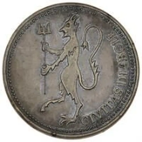 | Obverse description | They feature a horned, cloven-hoofed devil with a trident. |
