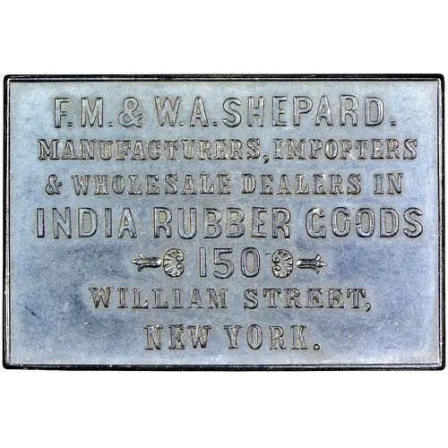 | Obverse lettering | F.M. & W.A. SHEPARD MANUFACTURES IMPORTERS & WHOLESALE DEALERS IN INDIA RUBBER GOODS 150 WILLIAM STREET NEW YORK |