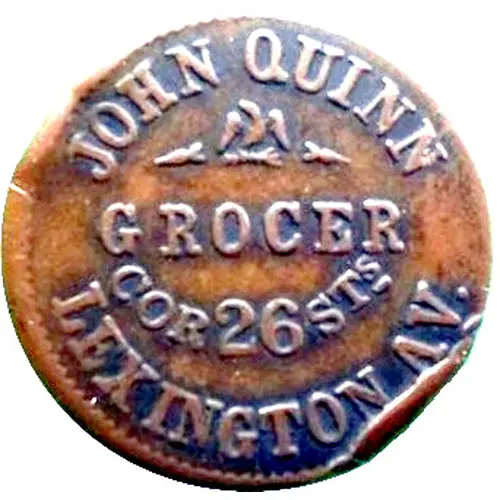 | Obverse lettering | JOHN QUINN GROCER COR 26 STs LEXINGTON AV. |