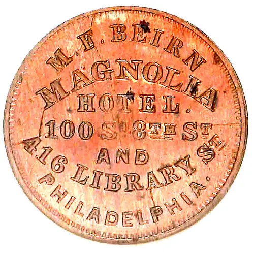 | Obverse lettering | M.F. BEIRN MAGNOLIATHOTEL 100 S 8TH ST & 416 LIBRARY ST PHILADELPHIA |