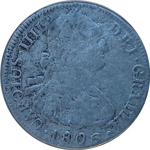 | Reverse lettering | LAS MONEDAS DE LOS BORBONES SERIE I CARLOS IIII 1806 4 REALES COLECCION `ORTIZ` (Translation: Borbon`s coins 1st. series Charles 4th. 1806 4 Reales Ortiz Collection) |